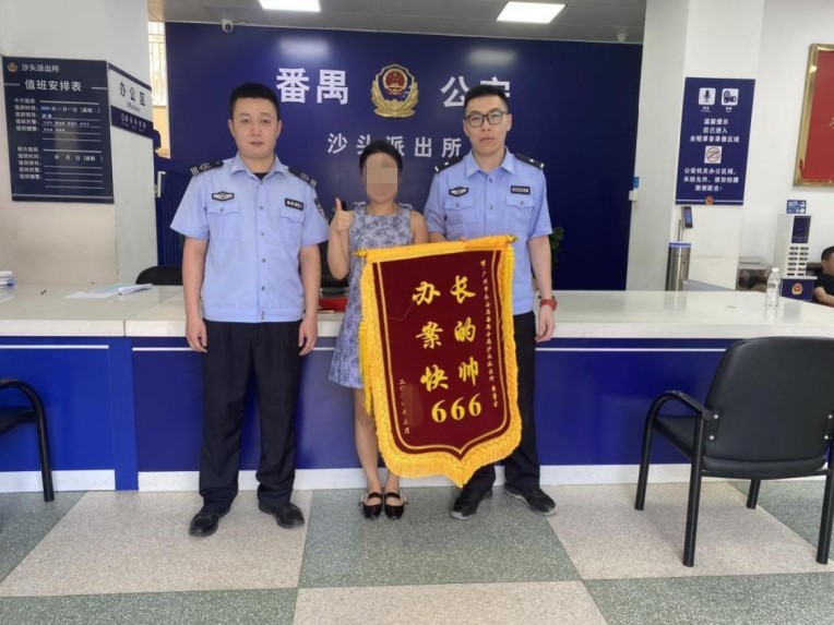 报警求助后仅18个小时,就顺利找回价值6万元的失物。5月7日,徐女士专门来到沙头派出所将一面印有“长的帅、办案快 666”字样的锦旗送到黄警官手中,感谢民警快速反应、妥善处置,有效避免群众财产损失。