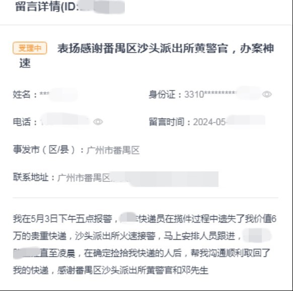“我价值6万元的快递遗失,民警火速接警,经过黄警官和邓警官的细心查找,不到一天就快速找回了,非常感谢!” 2024年5月9日,广州番禺警方收到市民徐女士在“平安厅”广州公安局长信箱发来的一封感谢信,对民警帮其快速寻回遗失快递包裹一事表示感谢。