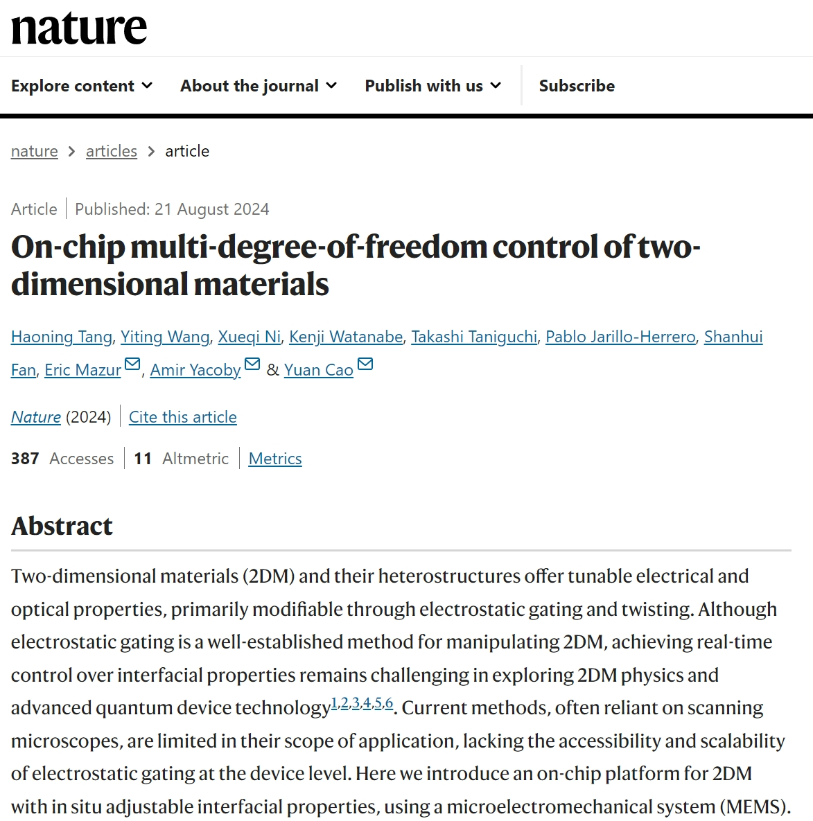 澎湃新闻记者查询发现,曹原及合作者今年8月21日在《Nature》发文《On-chip multi-degree-of-freedom control of two-dimensional materials》。截至目前,曹原已经发表9篇Nature和1篇Science。曹原上一篇Nature,还得追溯至2021年7月21日。